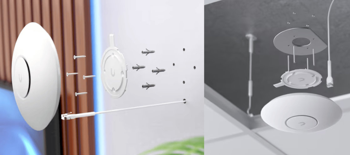 | Ubiquiti U7-LITE este gandit pentru montaj pe tavan sau pe perete si este livrat cu placa de montaj din plastic, astfel incat integrarea in spatiu sa fie discreta si curata. Carcasa este realizata din policarbonat stabilizat UV, pentru rezistenta in timp. LED-ul de stare alb/albastru ofera informatii vizuale rapide despre statusul sistemului si conectivitate. |  |