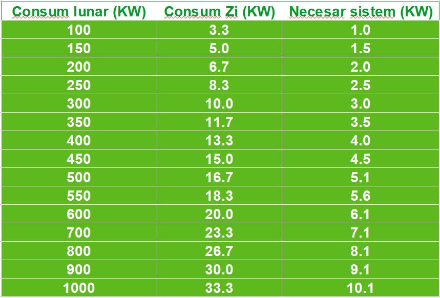 Oricum pentru a simplifica calculul, avand in vedere ca majoritatea locuintelor au un consum mediu intre 250KW si 1000KW am facut un tabel pentru dumneavoastra in care am trecut valorile pornind de la consumul mediu lunar la capacitatea sistemului fotovoltaic care acopera acest consum.