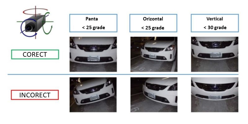 Unghiul la care se indreapta camera spre vehicul este, de asemenea, important. Utilizatorul trebuie sa tina cont de doua unghiuri: unghiul vertical dintre axa longitudinala a camerei si planul pe care se deplaseaza vehiculul si unghiul orizontal dintre axa longitudinala a camerei si axa longitudinala a vehiculului. Cu cat este mai mic unghiul, cu atat mai bine. Regula principala trebuie sa fie in limita a 30 de grade intre Pan si Tilt.