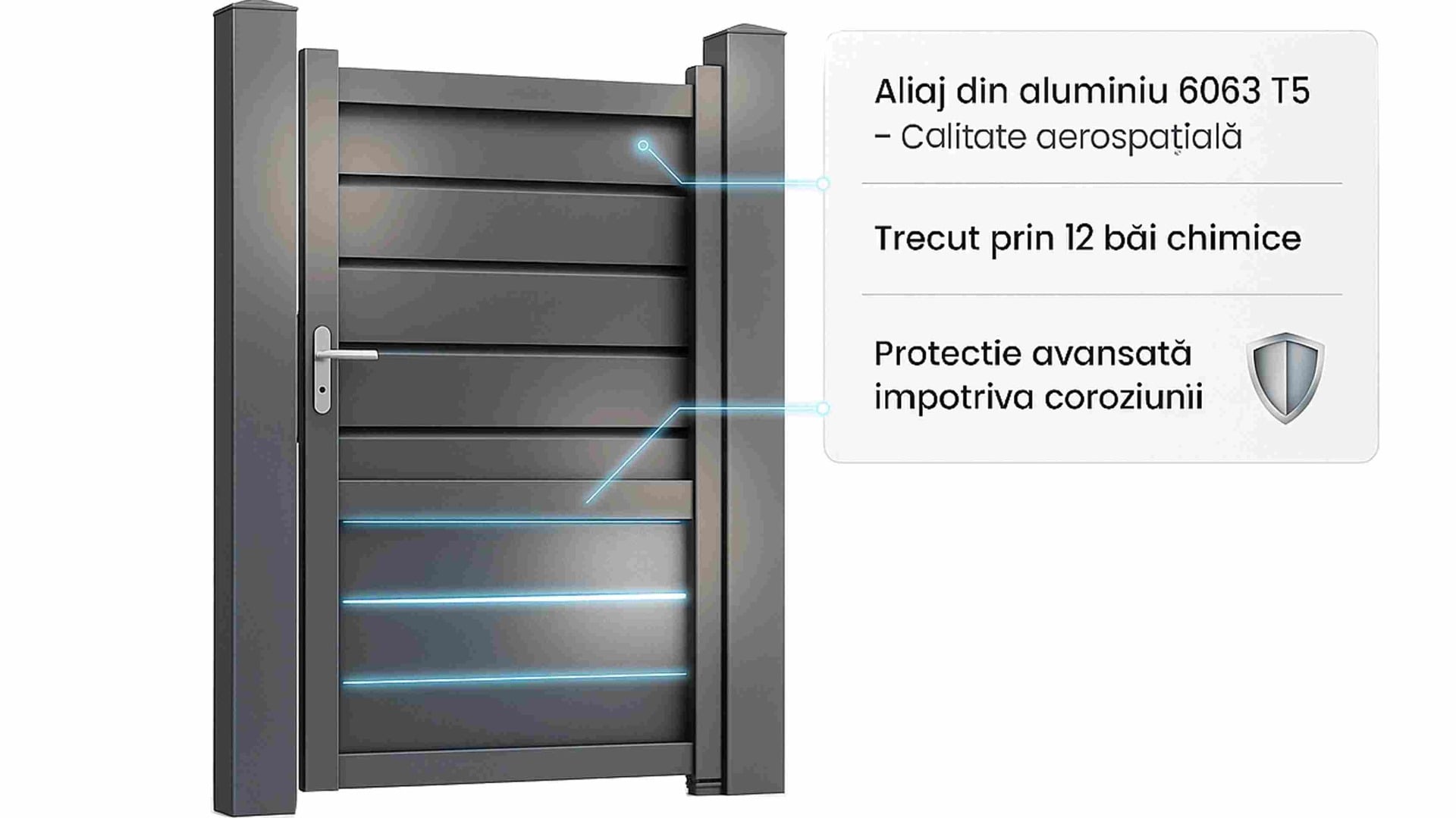Produsul functioneaza intr-un interval larg, de la -30°C la +70°C, fiind potrivit pentru conditii climatice variabile. Conductivitatea termica a aliajului 6063 (201-218 W/m·K) contribuie la disiparea eficienta a caldurii, reducand riscul de probleme in perioadele cu temperaturi ridicate. Poarta